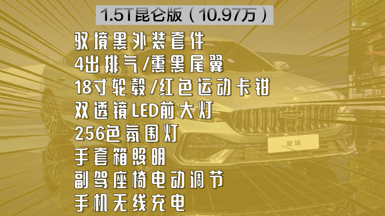 不过这个版本也有一个遗憾,那就是外观相对平淡,运动感稍微欠缺一点。这时候如果你能再追加5000,就可以买到1.5T 东方曜·昆仑版,首先外观增加了一套运动包围,有了四出排气,有了小尾翼,前大灯还有了双透镜的LED灯光效果。轮毂也大了一号,来到了18寸,并且卡钳变成了红色。整车看起来,质感要更出众一些。车内还增加了256色的氛围灯,副驾座椅电动调节,手机无线充电等实用配置。这5000毫无疑问也是相当的值。别忘了,这个版本还可以加6000,选装驾驶辅助系统和8155芯片。所以1.5T版本,不管你选装与否,都更推荐你买这个1.5T东方曜·昆仑版。比中低配没贵多少,质感和情绪价值的提升,那绝对是显而易见的。