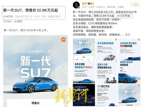 小米汽车的一记“回马枪”,并非什么颠覆性的技术发布,竟是一场令人啼笑皆非的价格乌龙。1月7日上午10点,雷军个人微博与官方公众号同步释放重磅消息,新一代SU7预售开启,那醒目的“22.59万元起”瞬间点燃了网络。就在消费者们摩拳擦掌准备抢订之时,眼尖的网友却发现了一个惊天反转:官方宣传海报上的价格明明白写着22.99万元起。这4000元的差价,犹如一颗投入平静湖面的石子,激起了层层涟漪,也引发了全网对于“雷总手滑”的热烈讨论。