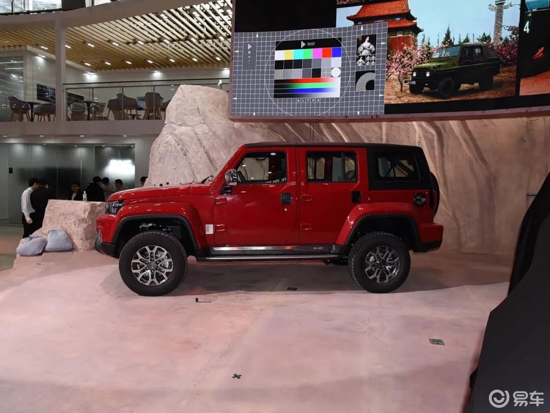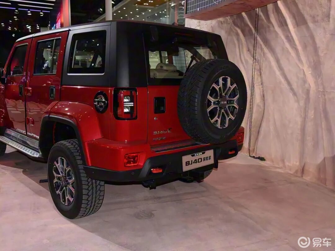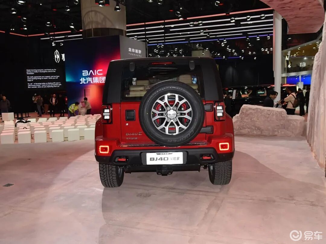 车身尾部,平直的线条搭配,两侧配备矩形的尾灯组,搭配高位刹车灯组,后窗雨刷器,外挂式后备胎设计,侧开式后备厢门,后包围配备红色的双侧拖车扣,中置的拖车钩,具备原厂拖拽资质。