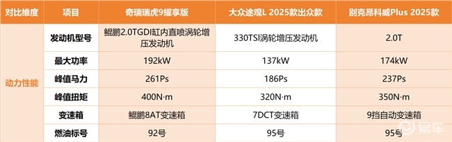 途观L龙耀版搭载330TSl涡轮增压发动机与7DCT变速箱,最大功率137kW,马力186Ps,峰值扭矩320N·m,动力基本可以满足基础通勤需求,其起步阶段动力响应偏缓,提速超车时需提前降档提速,虽然综合油耗为6.99L/100km,但加注95号汽油,长期用车成本略高于瑞虎9耀享版。昂科威Plus白金版配备2.0T发动机与9挡自动变速箱,最大功率174kW,峰值马力237Ps,峰值扭矩350N·m,动力表现整体优于途观L龙耀版,但爆发力与持续性输出能力相对偏弱,综合油耗7.99L/100km,需要加95号汽油,和瑞虎9耀享版相比出行成本更高。