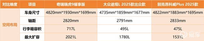 途观L龙耀版车身尺寸为4735mm*1859mm*1677mm,轴距2791mm,整体空间稍显紧凑,后排地台存在隆起,影响中间乘客乘坐体验,常规行李箱容积495L,最大扩展容积1780L,装载能力有限。昂科威Plus白金版轴距虽达2833mm,纵向空间尚可,但车身宽度仅1883mm,后排横向空间紧凑,常规行李箱容积仅475L,扩展容积1531L,面对多人出行的装载需求时略显吃力。