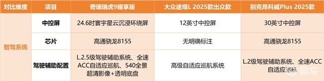 途观L龙耀版配置略显单薄,仅配备12英寸中控屏,车机系统功能简单,缺少手机互联功能,且驾驶辅助仅搭载带Stop&Go自动跟车启停的高级自适应巡航系统和碰撞警告系统基础功能,无全景影像,复杂路况泊车的便利性与安全性不足。昂科威Plus白金版虽配备30英寸中控屏与高通骁龙8155芯片,但仅搭载L2级驾驶辅助系统,功能丰富度与防护等级稍显逊色。