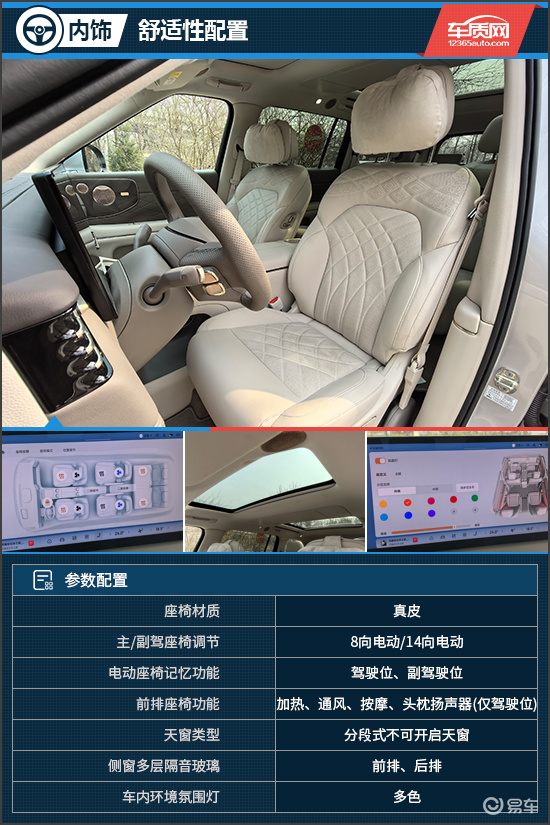 舒适性配置方面,评测车的座椅座垫柔软且头枕宽大,配合前排座椅加热、通风、按摩功能,能有效缓解长途乘车时的疲劳感。副驾驶位、第二排座椅均支持零重力模式,值得称赞。评测车采用分段式不可开启天窗,打开顶部遮阳帘后可以提供明亮的车内环境;后排侧隐私玻璃+手动侧窗遮阳帘的组合,也保障了车内拥有一个相对隐私的空间。