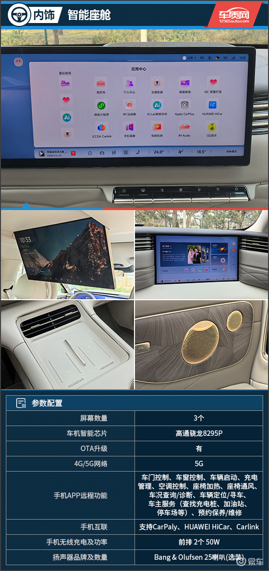 评测车的27.1英寸屏幕集仪表屏和中控屏于一体,分辨率达到5K,方便驾驶者便捷获取车辆信息。车机界面美观,操作流畅便捷,内置高通骁龙8295P芯片,不仅拥有CarPlay、HUAWEI HiCar、Carlink多种手机互联方式,还配备六区域语音唤醒识别、语音连续识别和可见即可说等实用功能,像生活中点餐、停车缴费等琐事,都可以交给AI Agent处理。同时,还贴心提供了15.6英寸副驾娱乐屏、21.5英寸后排液晶屏幕,全车乘员都能享受到娱乐出行带来的惬意体验。此外,中控台上方有两个手机无线充电板,充电功率均达到50W。选装的丹麦Bang&Olufsen豪华音响,音质效果也令人非常惊艳。