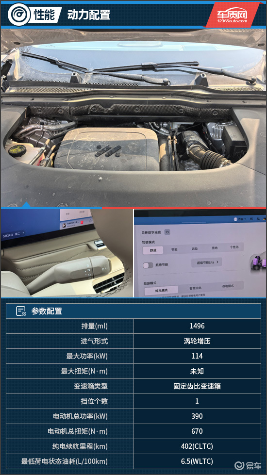动力系统方面,评测车搭载由1.5T涡轮增压发动机和双电机组成的恒星超级增程系统,发动机最大功率114kW,电动机总功率390kW、总扭矩670N·m,匹配固定齿比变速箱,CLTC纯电续航里程402km、综合续航里程1508km。