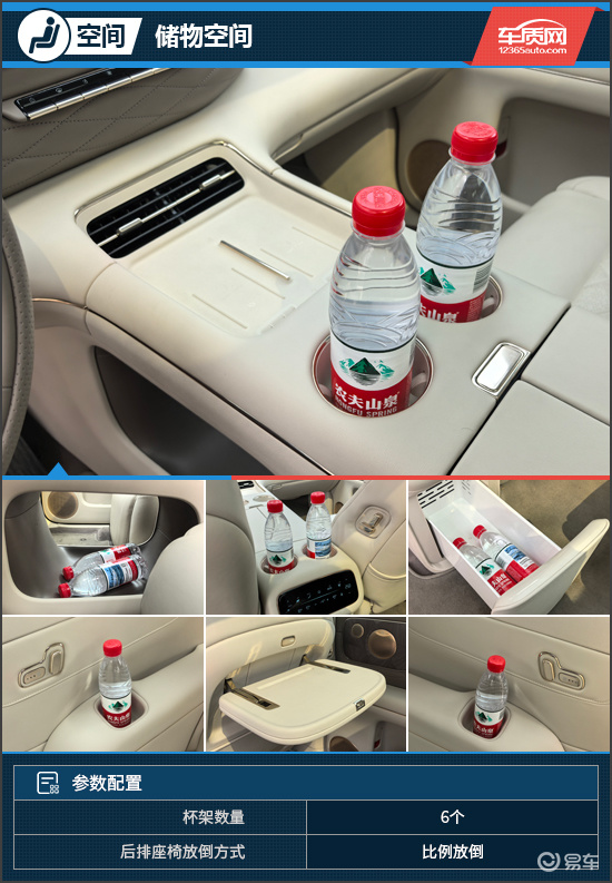 储物空间方面,评测车共有6个杯架,全车储物空间布局合理且容积可观。此外,中控台下方进行了掏空处理;车内还配备冷暖箱,可通过后排多功能控制屏进行开关、功能设置,冷饮热食随时取用。