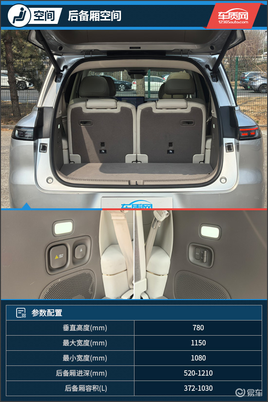 乘坐空间方面,得益于3160mm的长轴距,车内纵向空间很宽裕,身高180cm的体验者调整好前排舒适坐姿后来到第二排,腿部有2拳的距离,头部有2拳的距离,乘坐空间宽裕。保持第二排座椅不动,身高180cm的体验者来到第三排,腿部有2指的距离,头部有2指的距离,感受并不局促,实现全部乘员舒适平权,满足全家出行场景下的多人乘坐需求。