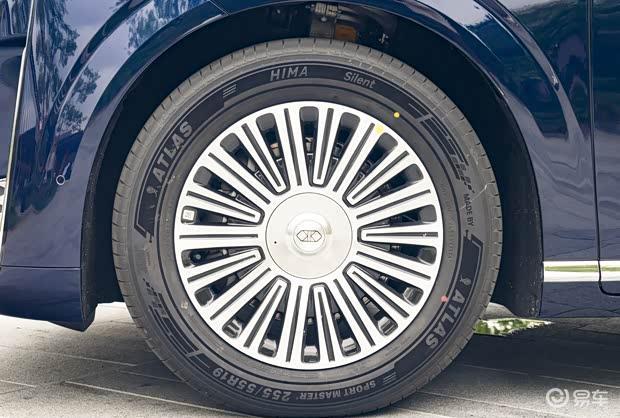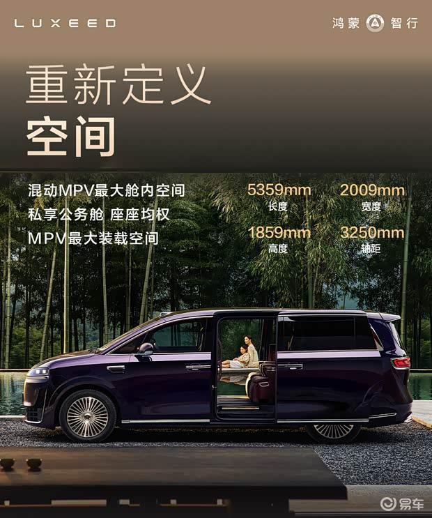车身侧面轮廓流畅优雅,长轴距与短前悬的设计不仅提升了视觉美感,也为车内三排空间带来更优表现。新车配备星光半隐藏式门把手及“星芒迎宾套件”,在车门开启时可自动点亮侧裙光毯与后视镜投影。车身采用高强度铝合金材质,并搭配20英寸多辐豪华轮圈。尺寸方面,其长宽高分别为5359mm/2009mm/1879mm,轴距达到3250mm,车内采用2+2+3七座布局。依托华为途灵智能底盘及后轮转向功能,这款车长超过5.3米的车型可实现最小5.35米的转弯半径,显著提升了操控灵活性。