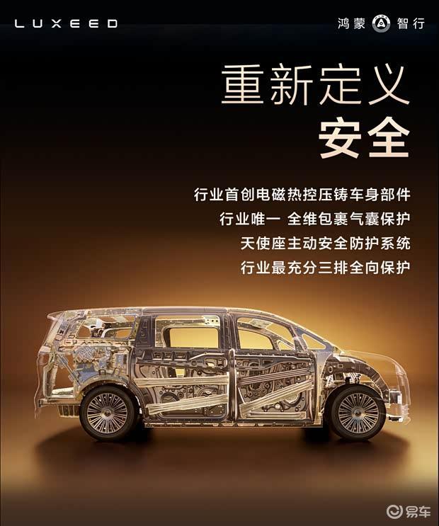 健康配置上,车辆搭载鸿蒙ALPS健康座舱,采用曾获诺贝尔化学奖表彰的MOFs材料,配合UVC紫外线杀菌模块及抗菌滤芯,可高效净化PM2.5、甲醛等污染物。座椅方面,第二排配备双零重力座椅,支持45°旋转迎宾、90°观景、180°对坐及大床模式,并提供10种车内布局选择,可一键调节靠背、腿托等。主副驾同样配备零重力座椅,后排设有双抽屉、折叠屏与小桌板。此外,新车还首发车内制氧机与夏季恒冷冰箱技术,标配全景防晒天幕、双层隔音玻璃、四区自动空调及前后排座椅加热、通风与按摩功能。后备厢空间规整,第二、三排座椅支持放倒,便于拓展储物空间。