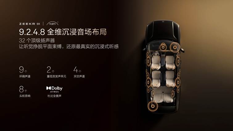 极氪9X每个座位都是黄金听位。全车共配备32个顶级扬声器,定制支持杜比全景声的9.2.4.8全维沉浸音场布局,为用户打造全场景沉浸式立体声,还原最极致的豪华声场。扬声器的材质选料考究,高频采用Naim专利「M型」钛膜,实现“高音甜、中音准、低音沉”的通透音质,配合Naim独立四音区技术,无论坐在车内的哪个位置,始终确保用户能够感受到最纯粹的天籁之声。