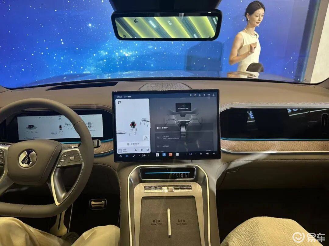 新车提供全新的“金山棕”内饰配色,视觉效果沉稳复古。内饰配备13.2英寸的2.5K液晶仪表屏+17.3英寸2.5K中控大屏以及13.2英寸的2.5K副驾屏幕,还包含50英寸的AR-HUD,26扬声器的帝瓦雷音响,DiLink 150座舱,车内配色上有铂檀灰和云锦米两种可选。