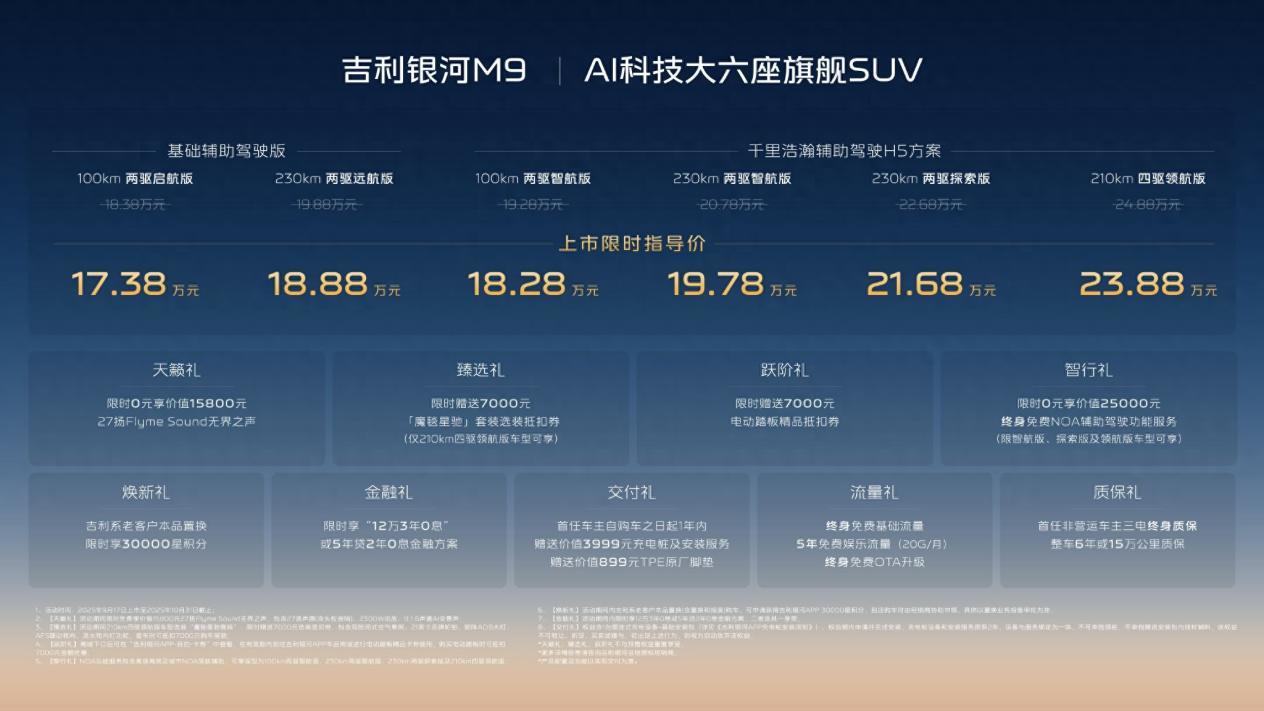 10月1日,吉利在沈阳车展上举办了银河M9的上市发布活动,提供100公里和230公里两种纯电续航共六款新车,限时17.38万元起。