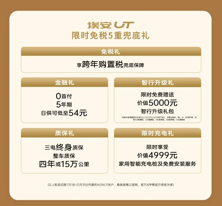 面对政策调整,各大车企纷纷推出 "兜底" 方案,但不同品牌的兜底政策存在显著差异。埃安 UT的跨年购置税兜底保障表现尤为突出。它推出的 "限时免税 5 重兜底" 政策规定:若因厂商生产、运输等非用户原因导致车辆在 2026年2月14日前完成开票交付,用户将享受购置税兜底保障,所产生的差额由厂家承担,补贴金额最高达15000元。这意味着即使在 2026年1月1日之后提车,只要是厂商原因导致的延期,消费者仍然可以享受相当于 2025 年的购置税优惠。同时,埃安 UT 还提供了多项年终冲刺政策,包括:价值5000元的智行升级礼包、价值4999 元的家用智能充电桩及免费安装服务、0首付5年期日供可低至54元的灵活金融方案。