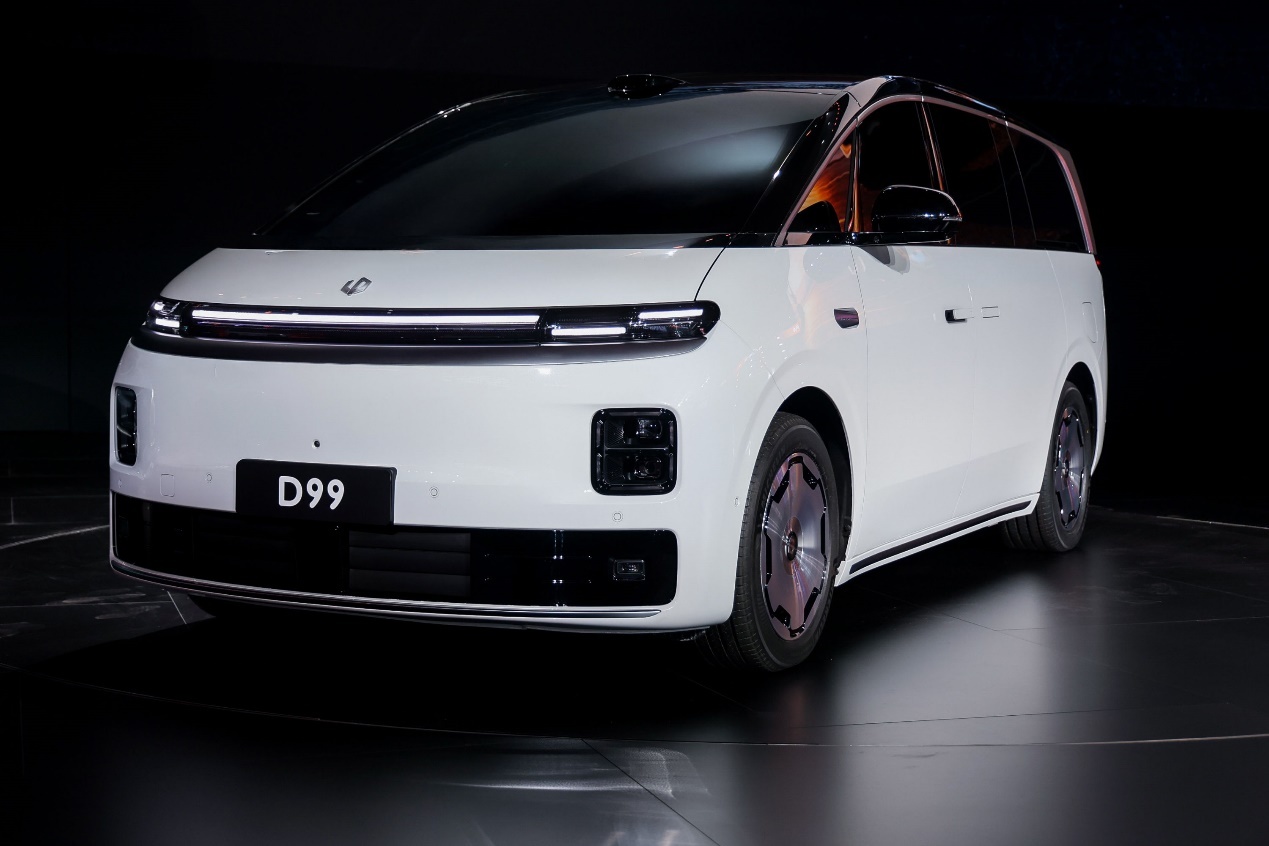 与D19一同亮相的还有MPV车型零跑D99。作为零跑汽车的首款 MPV 车型,D99定位科技豪华旗舰MPV。该车拥有超 5.2m 车长、近 2m 车宽、超 3.1m 轴距,前脸配备AGS主动进气格栅,百万像素DLP投影大灯,车头标志性的三段式的贯穿式灯带,车尾配备ISD智慧交互灯幕。